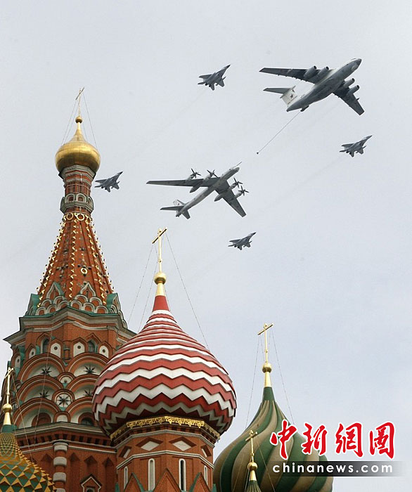 當(dāng)?shù)貢r(shí)間5月4日,在俄羅斯首都莫斯科,參加彩排的戰(zhàn)機(jī)編隊(duì)飛過紅場上空。俄羅斯將于5月9日隆重紀(jì)念衛(wèi)國戰(zhàn)爭勝利65周年。圖片來源:中國新聞網(wǎng)