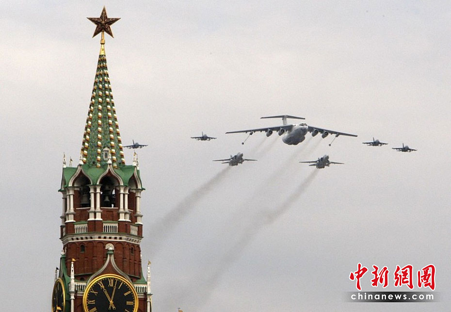 當(dāng)?shù)貢r(shí)間5月4日,在俄羅斯首都莫斯科,參加彩排的戰(zhàn)機(jī)編隊(duì)飛過紅場(chǎng)上空。俄羅斯將于5月9日隆重紀(jì)念衛(wèi)國戰(zhàn)爭(zhēng)勝利65周年。圖片來源:中國新聞網(wǎng)