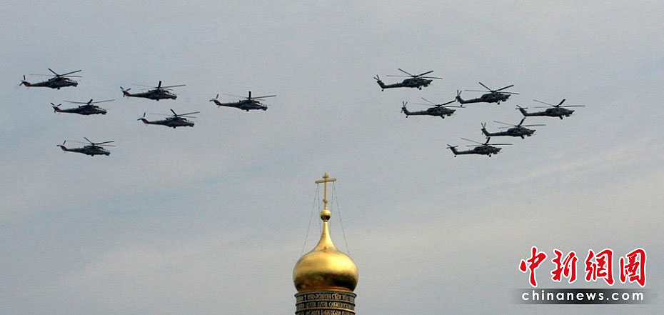 當?shù)貢r間5月4日,在俄羅斯首都莫斯科,參加彩排的戰(zhàn)機編隊飛過紅場上空。俄羅斯將于5月9日隆重紀念衛(wèi)國戰(zhàn)爭勝利65周年。圖片來源:中國新聞網(wǎng)