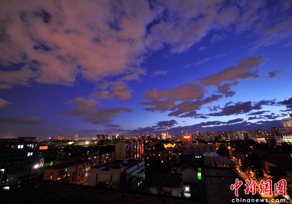 5月5日立夏,京城降雨今晨剛剛結(jié)束,霧氣伺機又起。傍晚時分,隨著四級北風(fēng)的到來,京城天氣逐漸轉(zhuǎn)晴,霧氣慢慢消散天空彤云密布夜色瑰麗。中新網(wǎng)記者 金碩 攝