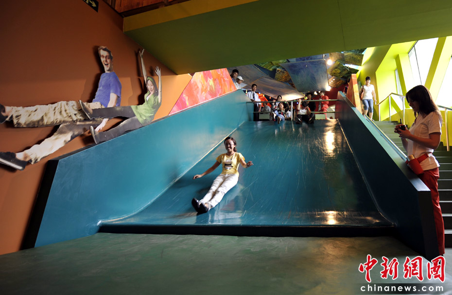 不愿走樓梯下樓的,還可以直接滑梯下來,一些成年人也紛紛找到了童年時的歡樂。中新網(wǎng)記者 王紅綱 攝