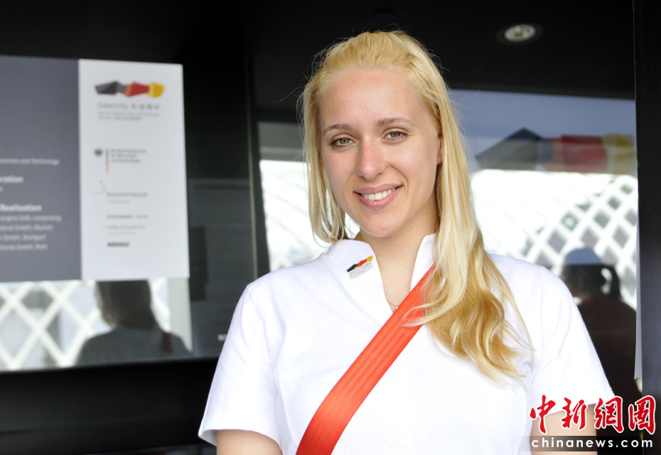 美麗的德國館工作人員,她們都能用一些簡單的漢語與中國游客交流。中新網(wǎng)記者 王紅綱 攝