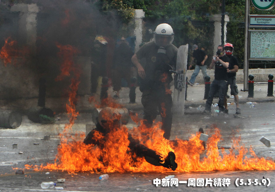5月5日周三,在雅典舉行的反對大幅削減開支的抗議活動中, 一名防暴警察被困在火焰彈引發(fā)的團(tuán)團(tuán)火焰中。