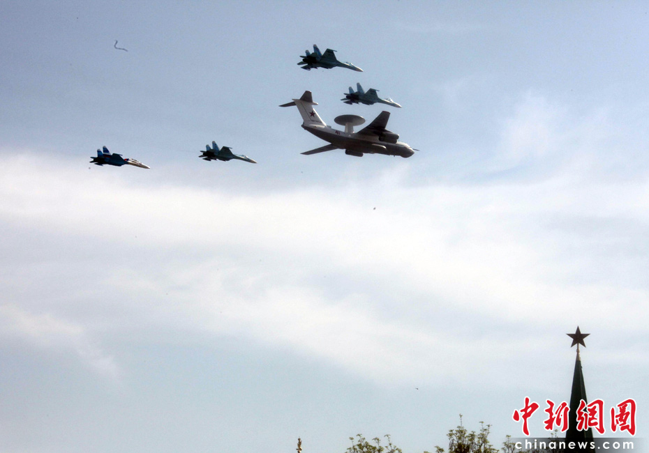5月9日,俄羅斯在莫斯科紅場(chǎng)舉行盛大的閱兵式,慶祝衛(wèi)國戰(zhàn)爭(zhēng)勝利65周年。莫斯科時(shí)間5月9日上午10點(diǎn)(北京時(shí)間9日下午2點(diǎn))許,閱兵式正式開始。2--圖為空中梯隊(duì)穿越紅場(chǎng)上空接受檢閱。張朔 攝