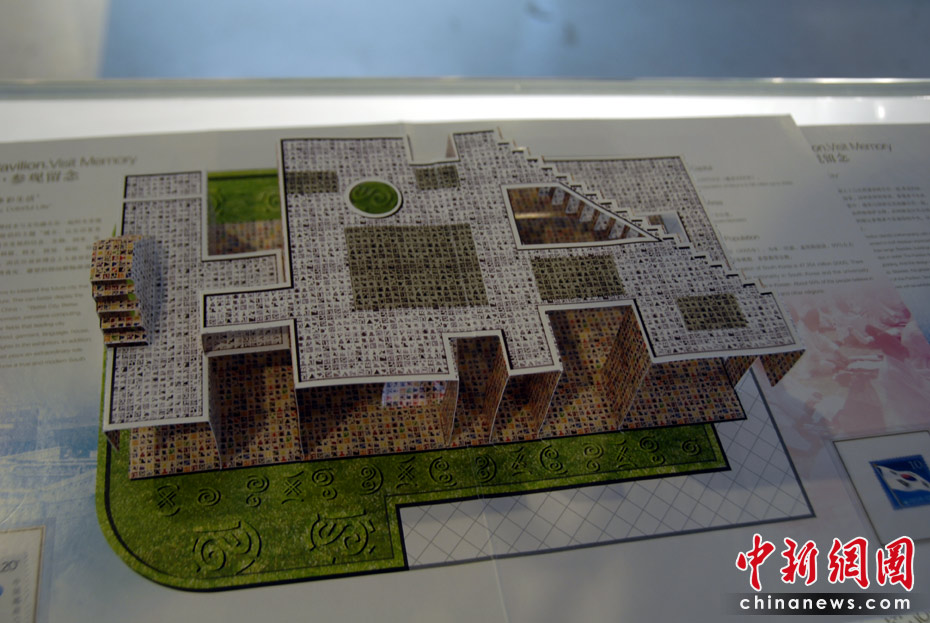 世博園區(qū)內(nèi)的特許商品店里,折紙場館惟妙惟肖,頗受游客的喜愛。圖為韓國館紙模型。中新網(wǎng)記者 吳歆 攝