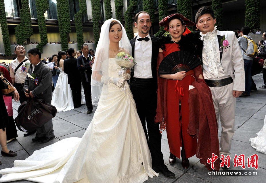 5月11日,35對(duì)新人來到世博法國(guó)館內(nèi)舉行婚禮儀式。法國(guó)館舉行“法蘭西浪漫婚典”的集體婚禮。中新社發(fā) 吳元峰 攝