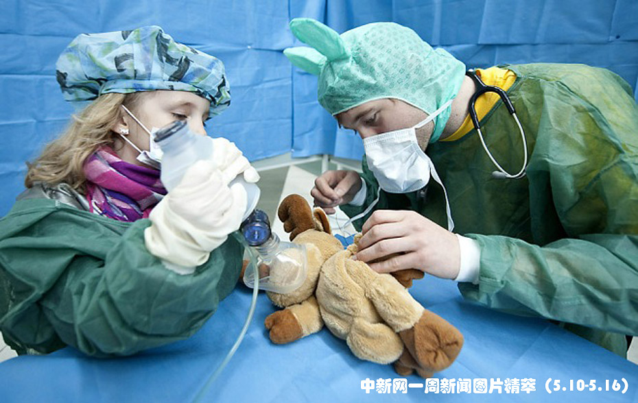 周一(10日),在德國柏林的菲爾紹臨床中心的“泰迪熊醫(yī)院”,萊奧尼(Leonie, 左)和一名醫(yī)科學(xué)生在為一個毛茸玩具動手術(shù)。這家醫(yī)院旨在減輕孩子們對醫(yī)生和醫(yī)療設(shè)備的恐懼感。