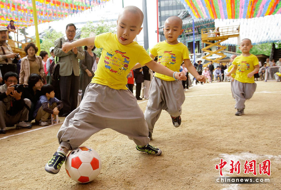 2010年5月15日,韓國首爾曹溪寺院舉行了兒童足球賽,一群四五歲的孩子和小和尚參加了這場足球友誼賽。這場比賽是佛誕節(jié)活動的一部分,也是為了迎接2010世界杯足球賽的到來。Chung Sung-Jun