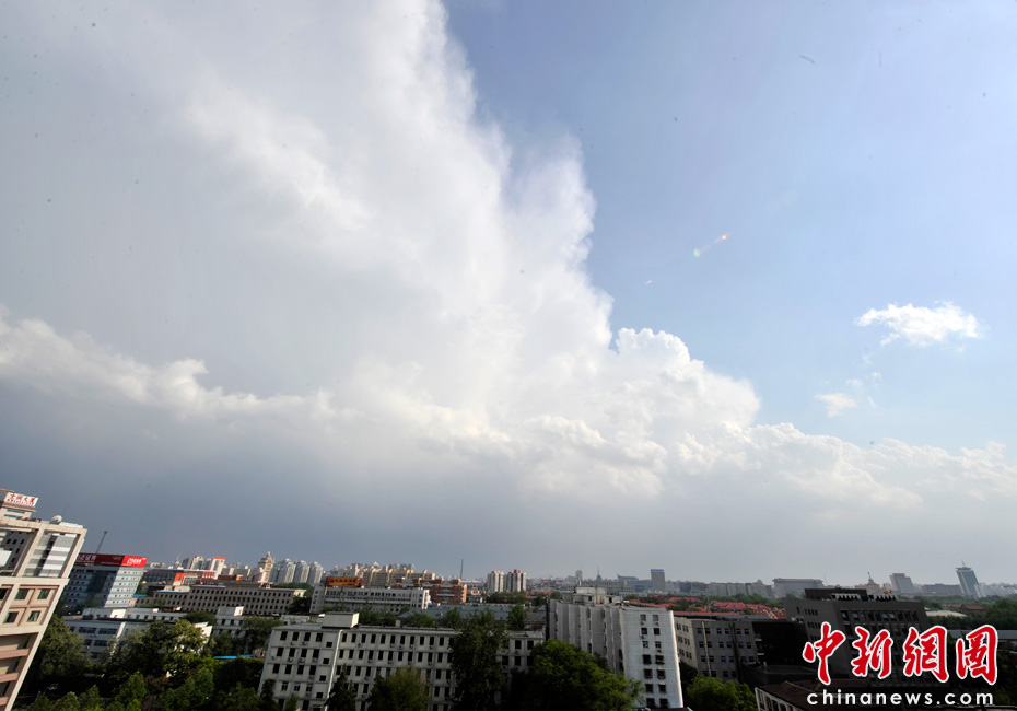 5月18日16時許,伴隨陣陣雷聲京城突降大雨,降雨過后東部天空依然籠罩著烏云,而西邊卻已放晴。中新網(wǎng)記者 金碩 攝