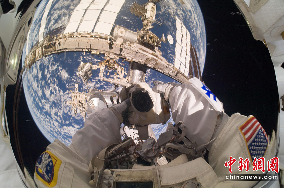 美國(guó)當(dāng)?shù)貢r(shí)間5月17日,“亞特蘭蒂斯”號(hào)航天飛機(jī)宇航員加雷特·賴斯曼和史蒂夫·鮑恩進(jìn)行了與國(guó)際空間站對(duì)接后的首次太空行走。圖片來(lái)源:中國(guó)新聞網(wǎng)