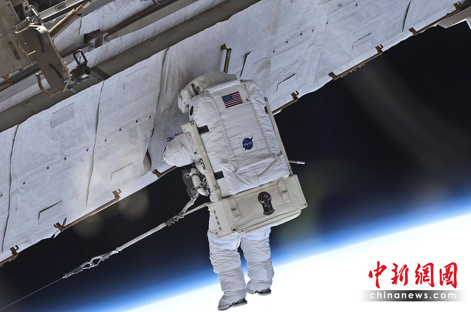 美國當(dāng)?shù)貢r間5月17日,“亞特蘭蒂斯”號航天飛機宇航員加雷特·賴斯曼和史蒂夫·鮑恩進(jìn)行了與國際空間站對接后的首次太空行走。圖片來源:中國新聞網(wǎng)