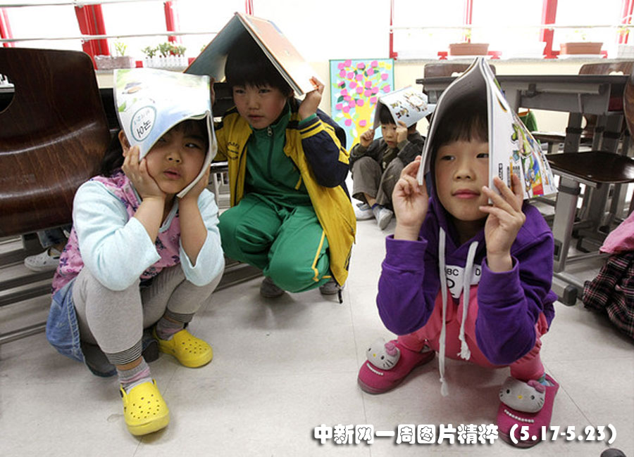 近日,首爾的一次地震演習(xí)中,韓國小學(xué)生將筆記本蓋在頭上蹲在課桌旁。各地方政府當天也參與了這次全國性的地震演習(xí)。
