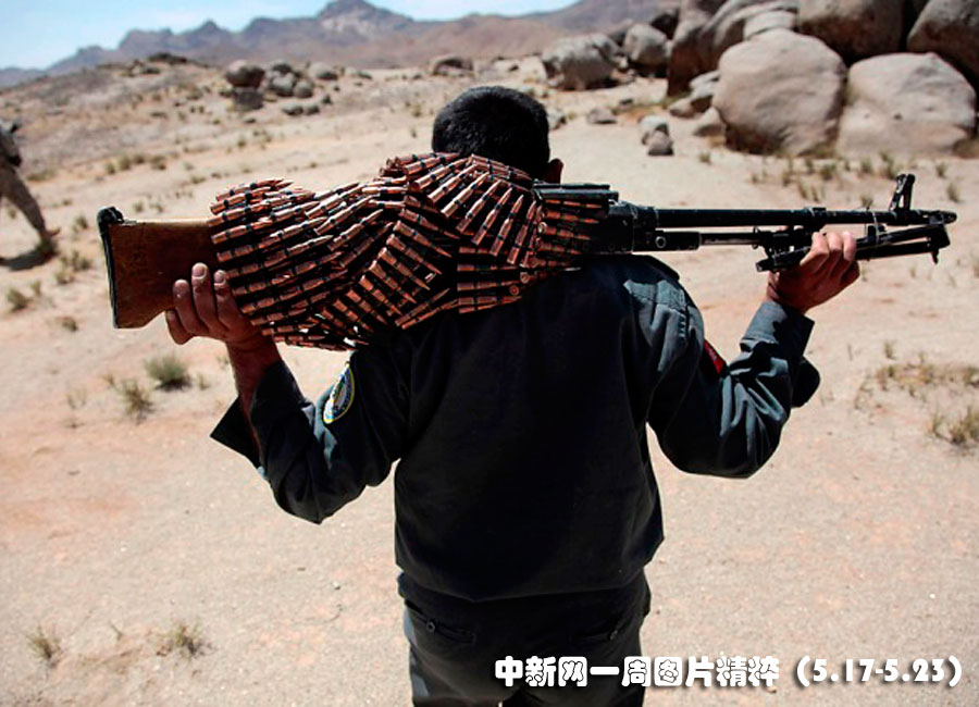 5月20日在阿富汗坎大哈,一名阿富汗國民警察扛著一挺機(jī)關(guān)槍和美國士兵一起巡邏。