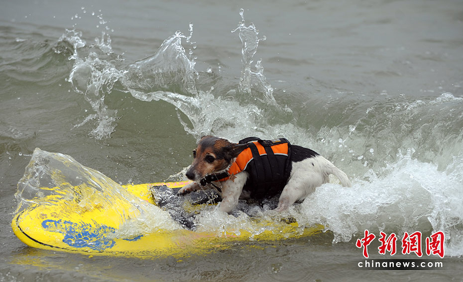 5月22日,美國加利福尼亞州圣迭戈舉行了一場妙趣橫生的狗狗沖浪比賽。圖片來源:中國新聞網(wǎng)