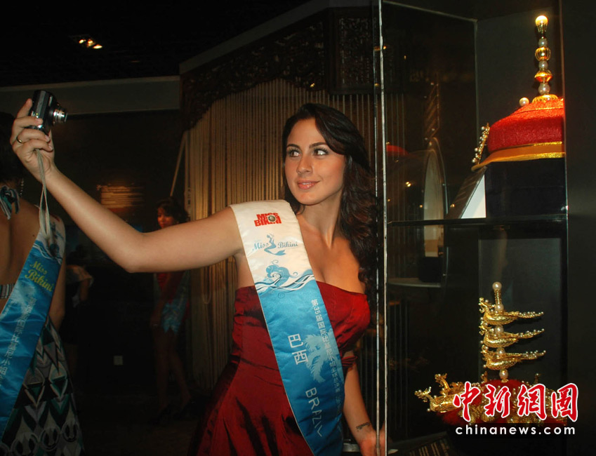 5月24日,海南三亞,正在此間參加第35屆國際比基尼小姐全球總決賽的64位佳麗,參觀了三亞一家珍珠博物館。佳麗們對(duì)漂亮的珍珠十分鐘愛,在攝影師前擺出各種“POSE”,留下美麗身影。圖為佳麗對(duì)漂亮的中國清朝時(shí)期皇后的皇冠(仿制品)興趣濃厚。中新社記者 尹海明攝