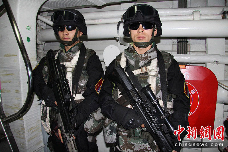 3月7日,新加坡海峽特戰(zhàn)隊員在船艙中集合。胡軍 攝