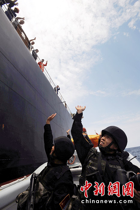 4月16日當(dāng)?shù)貢r間11時,第五批護航編隊圓滿完成第188批護航任務(wù),在“嘉永山”輪船實施隨船護衛(wèi)的4名特戰(zhàn)隊員換乘小艇離開時,船員紛紛來到甲板與他們揮手告別。江山 攝