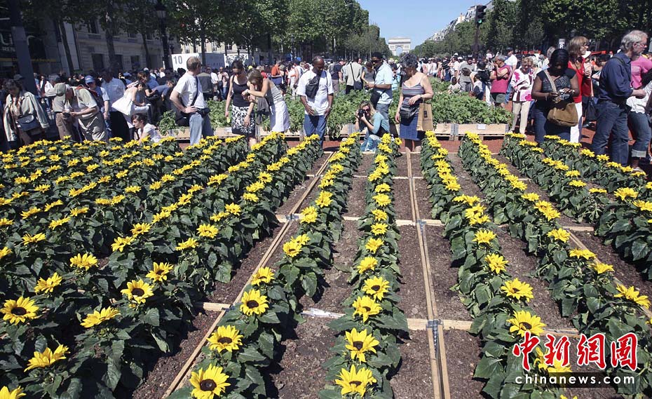 5月24日,法國總統(tǒng)薩科齊和妻子布呂尼參觀在法國巴黎舉行的“自然首都”展。該項展覽是由街頭藝術家加德·魏爾聯(lián)手法國“青年農(nóng)民協(xié)會”和林業(yè)協(xié)會共同發(fā)起的的,將百余種農(nóng)作物、樹木和動物“齊聚”法國首都巴黎的香榭麗舍大街,令這條“香街”變身“綠色的自然世界”。圖片來源:中國新聞網(wǎng)