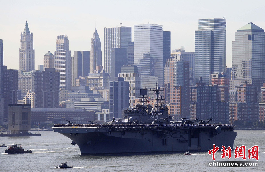 當(dāng)?shù)貢r間5月26日,美國第23屆紐約艦隊周開幕,包括“硫磺島”號兩棲攻擊艦在內(nèi)的11艘參加艦隊周活動的軍艦由南向北在哈得孫河面上游弋。紐約民眾將以?吭诼D哈得孫河86號碼頭的“無畏號”航母博物館為中心,展開為期一周的慶祝和紀念活動。圖片來源:中國新聞網(wǎng)