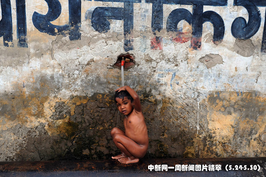 27日(周四),一名印度兒童在水管下沖洗,抵抗炎熱。