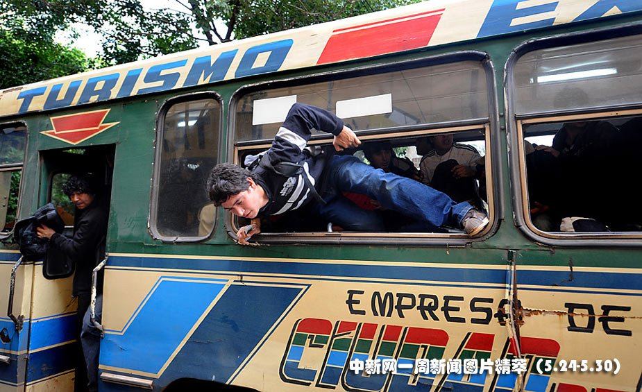 27日(周四),在巴拉圭首都亞松森,示威者向公交車投擲石頭,乘客們紛紛跳出公交車。部分公交車司機舉行罷工,要求加薪。