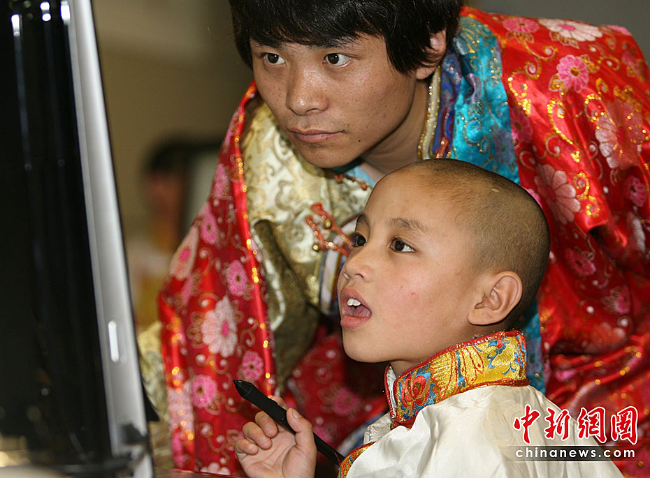 5月31日,玉樹地震孤兒多杰仁青在老師的指導下在北京國家圖書館體驗新開通的少兒數(shù)字圖書館,迎接六一兒童節(jié)。這批玉樹孤兒共23名,于5月23日抵京,由“中華少年兒童慈善救助基金會”安置。在北京度過“六一”后,他們還將休整3個月,待災區(qū)情況穩(wěn)定后,中華兒慈會將與當?shù)氐拿裾块T協(xié)商,在征求孤兒本人意愿的基礎上,或讓他們返回原地上學,或者在內(nèi)地長期居住;饡䦟⒁恢敝С炙麄兊18歲成人。中新社發(fā) 蘇丹 攝