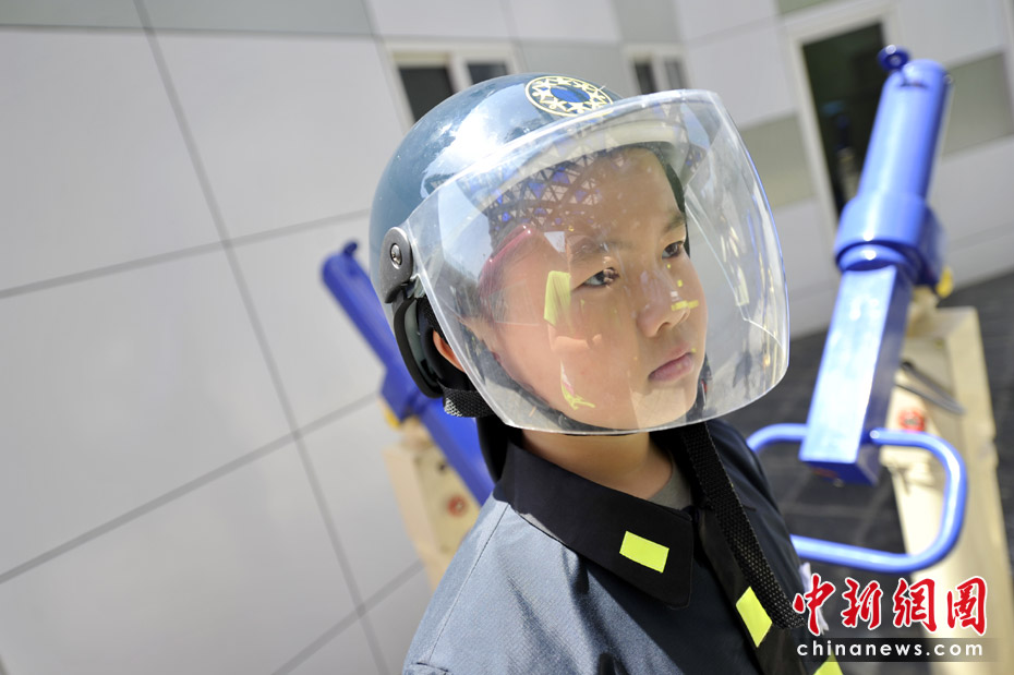 圖為一個(gè)孩子在體驗(yàn)消防員的角色。 中新網(wǎng)記者 王紅綱 攝