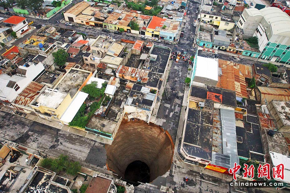5月31日,受颶風(fēng)“阿加莎”的影響,危地馬拉首都危地馬拉城出現(xiàn)一個(gè)深達(dá)60米塌陷洞,有目擊稱(chēng)一幢3層建筑墜入洞中,至少造成1人死亡。圖片來(lái)源:中國(guó)新聞網(wǎng)