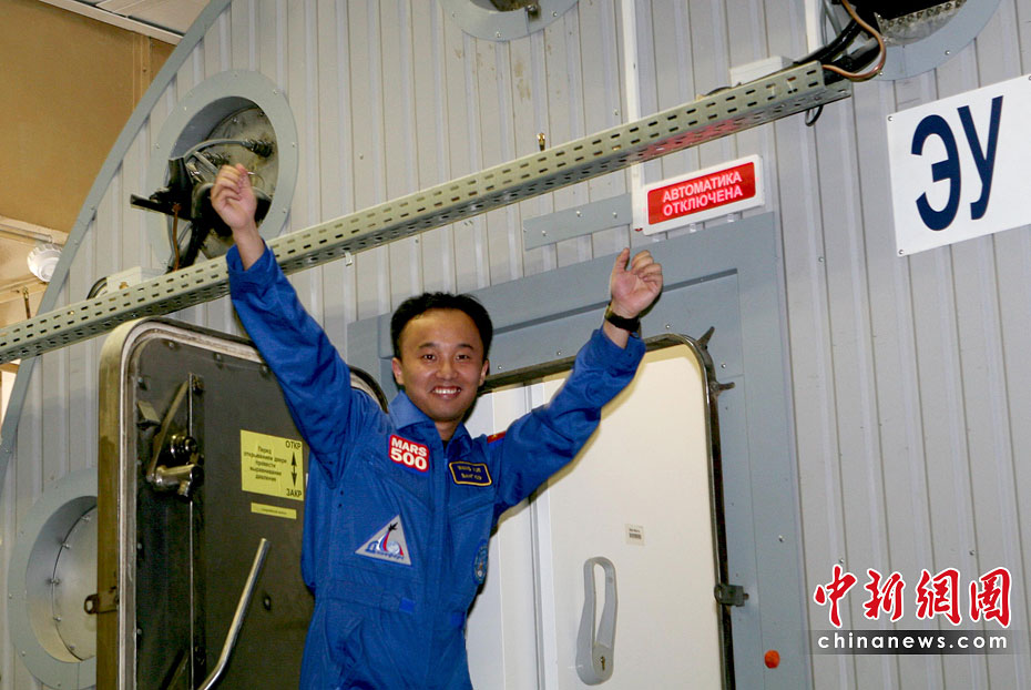 當?shù)貢r間6月3日14時,“火星-500”實驗艙最后一道艙門關閉,人類歷史上首次模擬火星載人航天飛行試驗就此拉開帷幕。圖為進艙前王躍和大家作最后道別。中新社發(fā) 田冰 攝