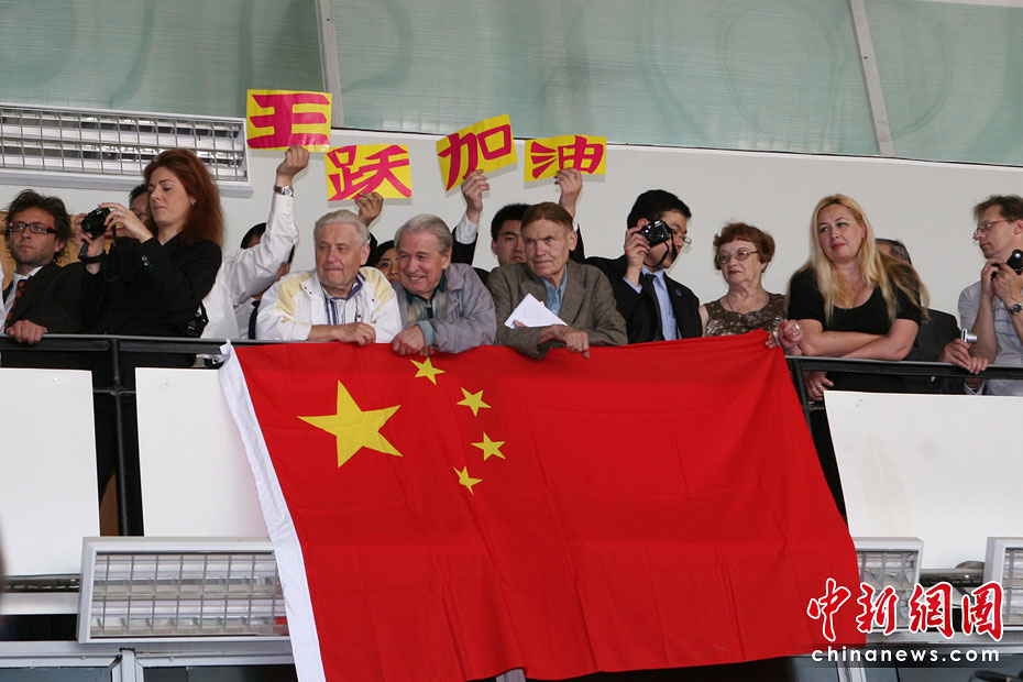當(dāng)?shù)貢r(shí)間6月3日14時(shí),“火星-500”實(shí)驗(yàn)艙最后一道艙門關(guān)閉,人類歷史上首次模擬火星載人航天飛行試驗(yàn)就此拉開(kāi)帷幕。中國(guó)參試項(xiàng)目團(tuán)隊(duì)現(xiàn)場(chǎng)為王躍加油。中新社記者 田冰 攝