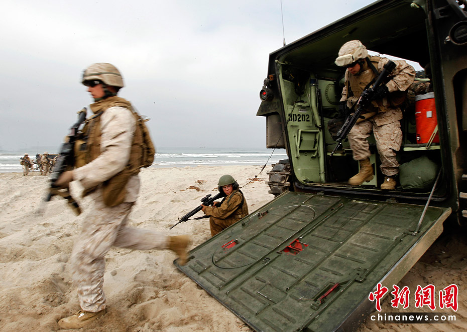 當?shù)貢r間6月4日,約5000名水兵和陸戰(zhàn)隊員在美國加利福尼亞州舉行了代號為“黎明突擊”的搶灘登陸軍事演習。圖片來源:中國新聞網(wǎng)