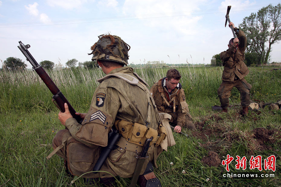 6月5日,諾曼底登陸66周年前夕,一批演員身著二戰(zhàn)時期美軍軍服,在法國諾曼底卡倫坦重現(xiàn)了這次著名的戰(zhàn)役。