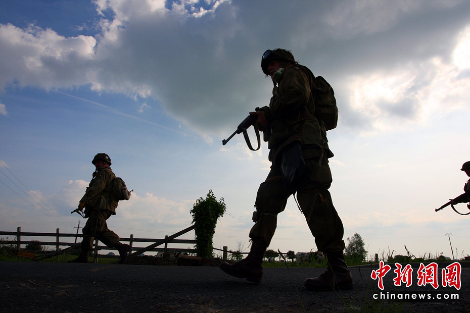 6月5日,諾曼底登陸66周年前夕,一批演員身著二戰(zhàn)時(shí)期美軍軍服,在法國諾曼底卡倫坦重現(xiàn)了這次著名的戰(zhàn)役。