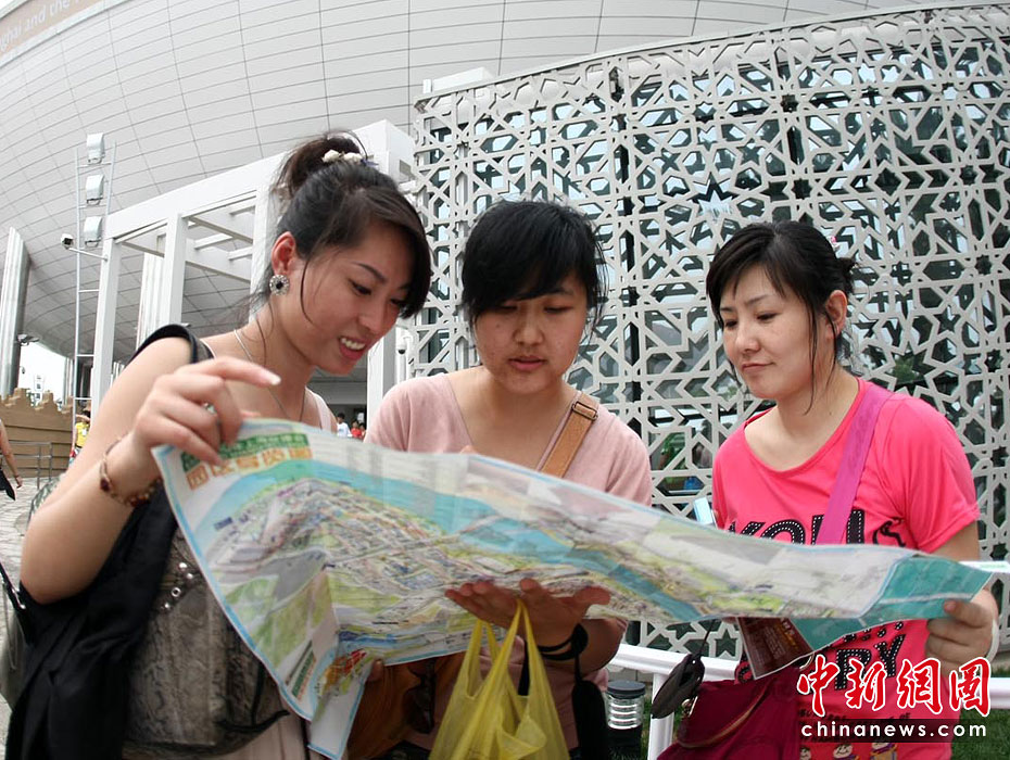 截至6月5日19點(diǎn)30分,上海世博會(huì)累計(jì)參觀者已超過1000萬人次。據(jù)悉,上海世博會(huì)的規(guī)劃用地為5.28平方公里,約242個(gè)國家和國際組織參展分布在浦東和浦西兩大區(qū)域。要想在這么大的地方找到自己想去的地方,那么世博地圖就是必須的裝備。圖為上海世博園內(nèi)游客正在地圖上尋找自己要去的地方。中新社記者 杜洋 攝