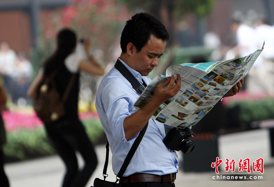 截至6月5日19點(diǎn)30分,上海世博會累計(jì)參觀者已超過1000萬人次。據(jù)悉,上海世博會的規(guī)劃用地為5.28平方公里,約242個國家和國際組織參展分布在浦東和浦西兩大區(qū)域。要想在這么大的地方找到自己想去的地方,那么世博地圖就是必須的裝備。圖為上海世博園內(nèi)游客正在地圖上尋找自己要去的地方。中新社記者 杜洋 攝