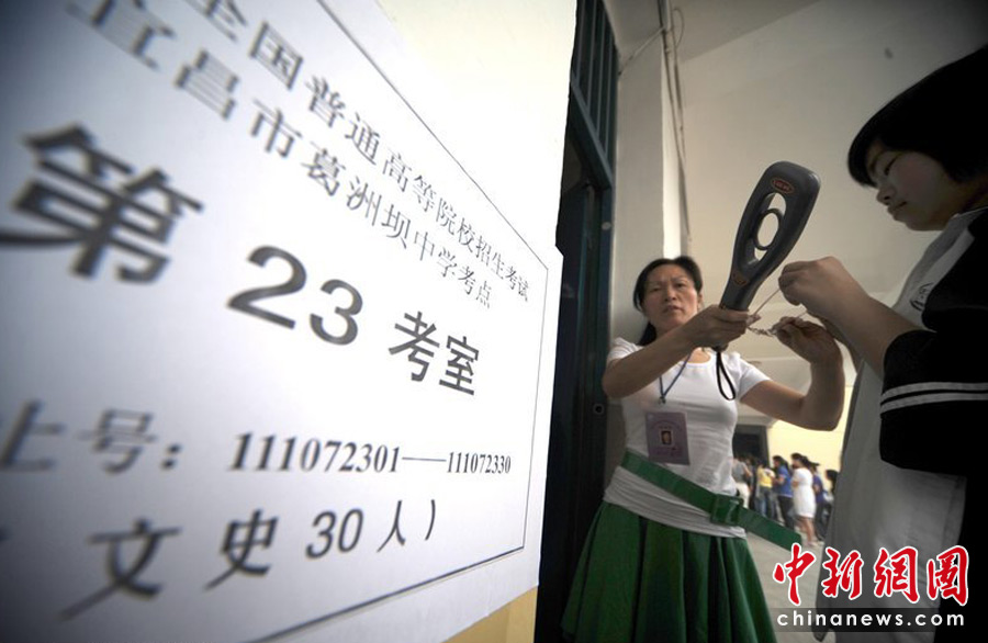 2010年全國高考6月7日日拉開大幕,957萬考生走進(jìn)考場。由于報名人數(shù)減少,而招生計劃增加,教育部預(yù)計今年全國高考平均錄取率將會增加近7%。6月6日下午,參加2010年高考的湖北宜昌考生走進(jìn)葛洲壩中學(xué)考點(diǎn)熟悉考場,進(jìn)場前,監(jiān)考老師手持金屬探測儀器對考生一一進(jìn)行認(rèn)真的安全檢查。劉曙松/CFP