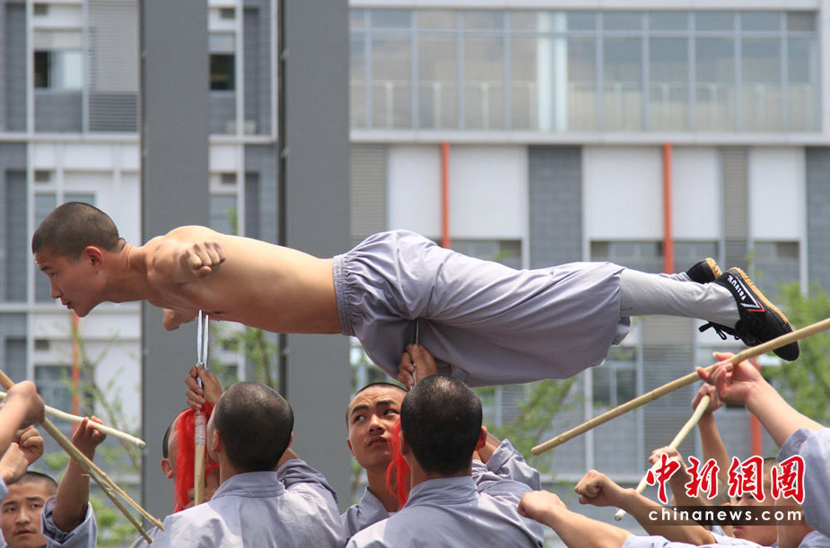 自5月1日開始,上海世博園D片區(qū)綜藝廣場(chǎng)每天都有少林寺功夫展演,受到世博參觀者的熱捧。中新社記者 殷春永攝
