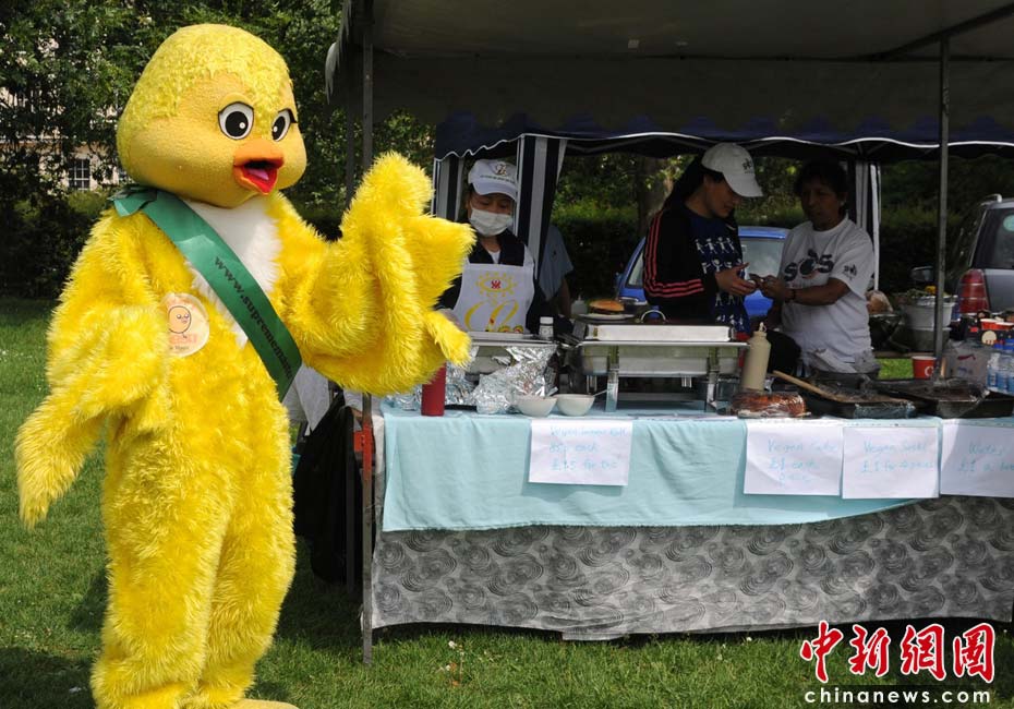 當(dāng)?shù)貢r(shí)間2010年6月6日,英國(guó)倫敦舉行卡姆登綠色市集(Camden Green Fair),這是英國(guó)倫敦每年環(huán)保領(lǐng)域的“重頭戲”。本屆市集的主旨是要喚起大眾對(duì)環(huán)境問題的關(guān)注,選擇更加可持續(xù)發(fā)展的生活方式。據(jù)活動(dòng)主辦方預(yù)計(jì),本屆市集將吸引來自英國(guó)各地和世界各國(guó)的2萬(wàn)多人參加。圖為打扮成小雞的素食主義者宣傳素食。Fiona/攝 Fiona 馬小剛/文