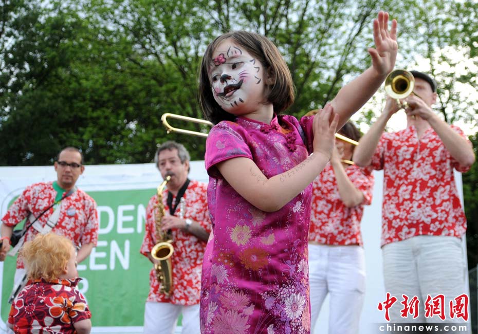 當?shù)貢r間2010年6月6日,英國倫敦舉行卡姆登綠色市集(Camden Green Fair),這是英國倫敦每年環(huán)保領(lǐng)域的“重頭戲”。本屆市集的主旨是要喚起大眾對環(huán)境問題的關(guān)注,選擇更加可持續(xù)發(fā)展的生活方式。據(jù)活動主辦方預計,本屆市集將吸引來自英國各地和世界各國的2萬多人參加。圖為一名英國小女孩兒身著中式旗袍翩翩起舞,宣傳環(huán)保。Fiona/攝 Fiona 馬小剛/文