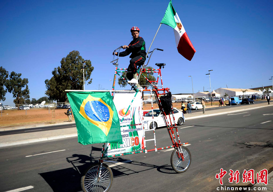 當(dāng)?shù)貢r(shí)間6月9日,南非約翰內(nèi)斯堡足球城,一名球迷騎行特型自行車。中新社發(fā) 廖攀 攝