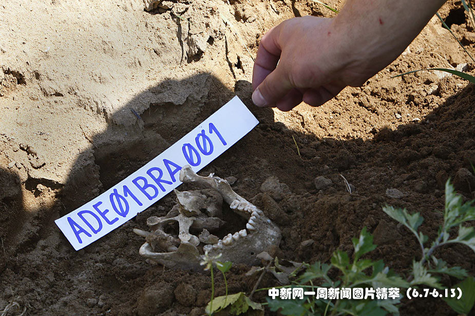 周三(9日),在波黑的布拉圖納茨,一名法醫(yī)工作者給尚未出土的人類遺骸做標(biāo)記。