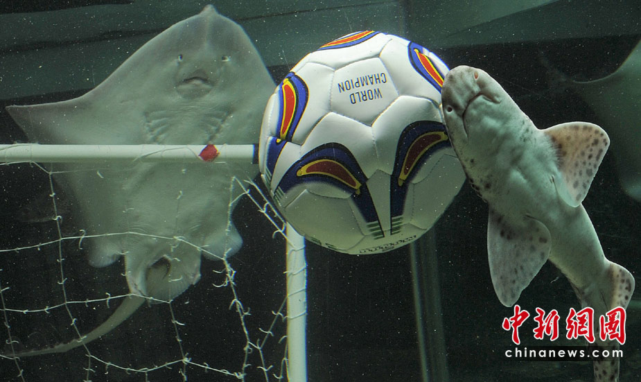 當(dāng)?shù)貢r(shí)間6月15日,德國北部,水族館里的海洋生物爭搶填滿飼料的足球。