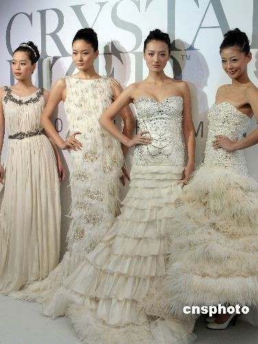 11月18日,一場時(shí)尚婚禮匯展在上海舉行,耀眼奪目的水晶婚紗禮服吸引了不少參觀者的“眼球”。圖為模特展示水晶婚紗禮服。中新社發(fā) 湯彥俊 攝