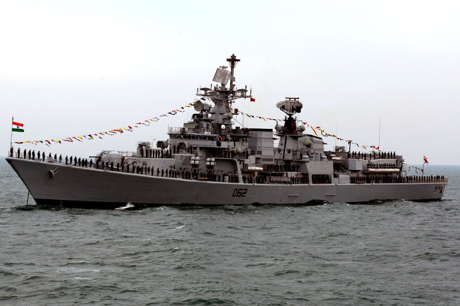 中國歷史上的首次多國海軍檢閱活動四月二十三日下午在青島附近黃海海域舉行。中國國家主席、中央軍委主席胡錦濤乘閱兵艦“石家莊”號導(dǎo)彈驅(qū)逐艦,檢閱中國海軍的潛艇、水面艦艇、海軍航空兵和海軍陸戰(zhàn)隊(duì)等作戰(zhàn)兵種,并檢閱了來訪的十四個國家的二十一艘艦艇。圖為參加檢閱的印度海軍“孟買”號導(dǎo)彈驅(qū)逐艦。中新社發(fā) 宋吉河 攝