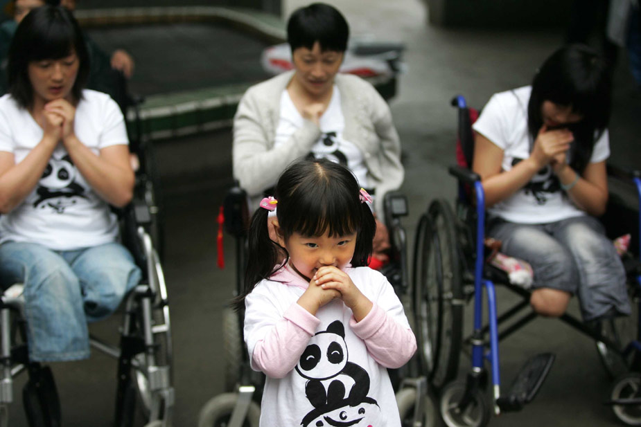 5月7日,小朋友王詩琪(前)及母親楊蘭(后左)還有幾位肢殘患者一起用手語演唱“感恩的心”。這對(duì)母女是汶川人,在大地震中女孩的父親不幸遇難,母親失去的雙腿,在康復(fù)中心楊蘭得到了全面的治療。四川大地震一周年之際,共計(jì)幾十家境內(nèi)外媒體的記者走進(jìn)位于四川省人民醫(yī)院內(nèi)的地震傷員康復(fù)中心。該中心去年六月二十三日成立后到今年四月三十日新收治地震傷員二百三十四人。中新社發(fā) 富田 攝