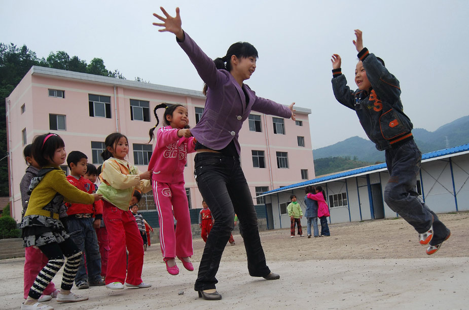 2009年5月4日,全國抗震英雄---陜西寧強黃壩驛鄉(xiāng)中心小學教師王敏,正在和學生們一起做老鷹抓小雞游戲,用歡笑聲驅散了地震帶來的陰霾。當日她榮獲第十三屆“中國青年五四獎!