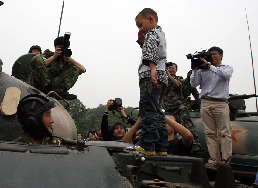 4月25日,汶川大地震幸存者“敬禮娃娃”郎崢一家來到成都軍區(qū)駐渝某部營(yíng)區(qū),感謝該部戰(zhàn)士在廢墟中救出郎崢的性命。2008年5月13日晨,3歲的郎崢被解放軍官兵從廢墟里救出后,躺在一塊小木板做的臨時(shí)擔(dān)架上,用他稚嫩的右手向8位抬著他的解放軍叔叔敬了個(gè)少先隊(duì)禮,他的舉動(dòng)引起社會(huì)各界高度關(guān)注,被媒體稱為“敬禮娃娃”。圖為郎崢在營(yíng)區(qū)內(nèi)見到夢(mèng)寐以求的坦克,爬到坦克車上用一個(gè)軍禮向解放軍叔叔表示感謝。中新社發(fā) 郭晉嘉 攝