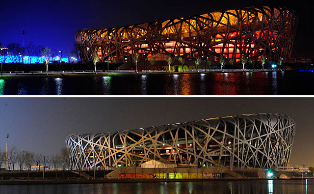 中國(guó)北京。3月28日,熄燈前后的國(guó)家體育場(chǎng)“鳥巢”。