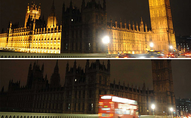 英國倫敦:3月28日,位于倫敦的英國議會大樓熄燈時和重新亮燈后的對比情況。