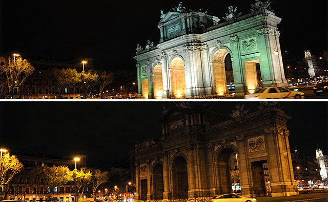 西班牙馬德里:3月28日,西班牙馬德里市中心的標志性建筑阿爾卡拉門熄燈前后的對比情況。